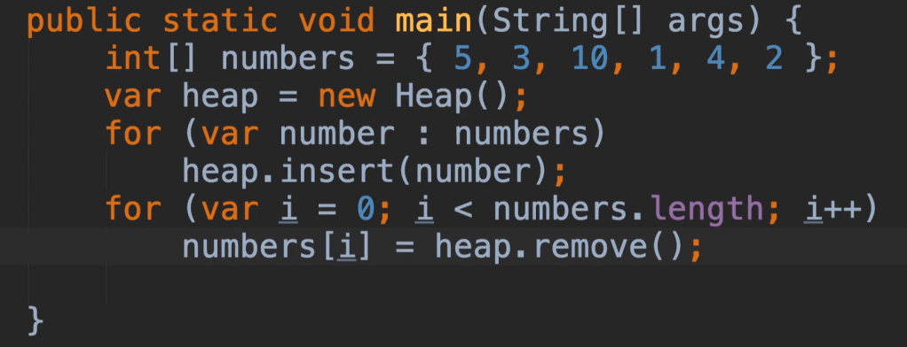 - remove(): move the last item to the root, compare with its chidren, if it’s smaller, bubble down until the right position O(log(n))