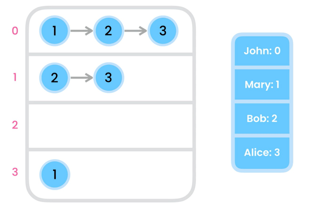 - Adjacent List: array of linked lists, the linked list contains adjacent nodes, only store the edges that exist