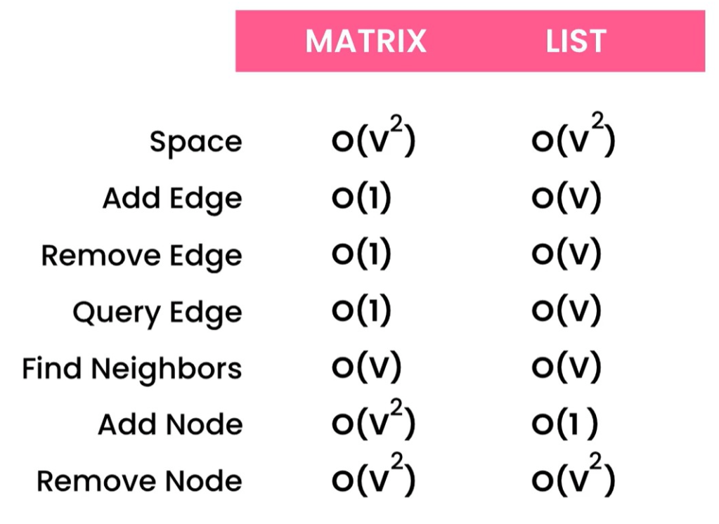 - Add edge: O(K) (K is the number of the neighbors ), worst case: O(V) (multi graph, two nodes can be connected by multiple edges: O(1))