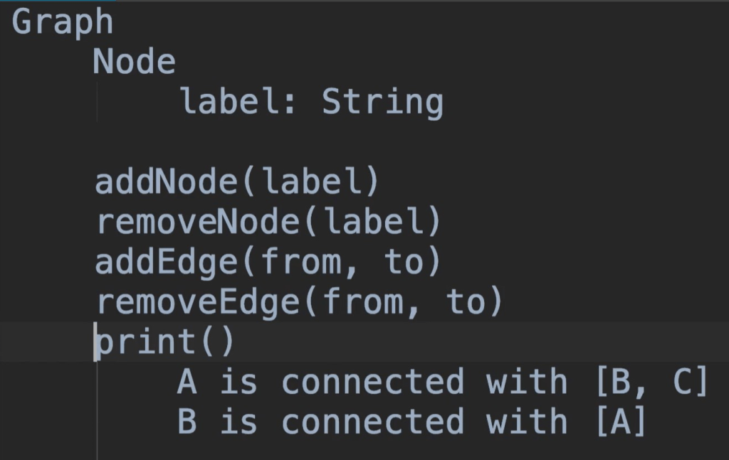 - remove nodes and edges: remove all the connections, remove from adjacencyList, remove from nodes list