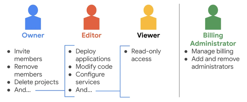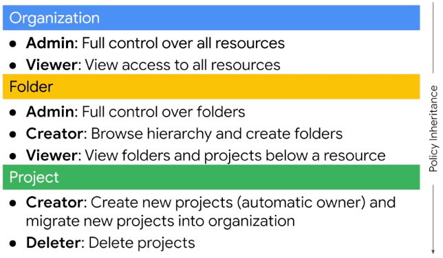 - Organization Admin: Control over all cloud resources; useful for auditing