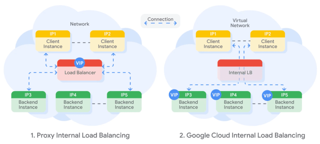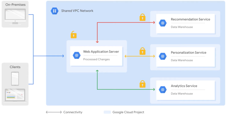 - Communicate within Shared VPC using private IP, host project with external networks using public IP