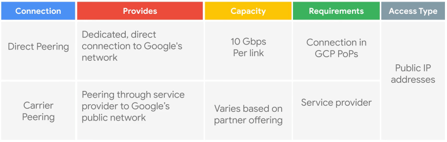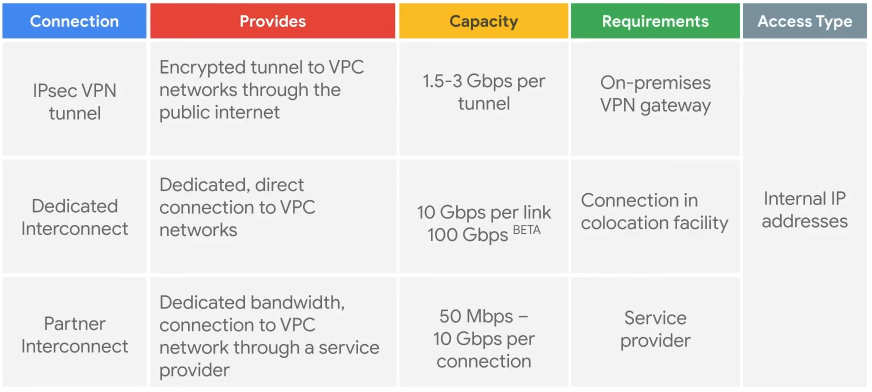 - Dedicated Interconnect provides direct physical connection between your on-premises network and GCP network
